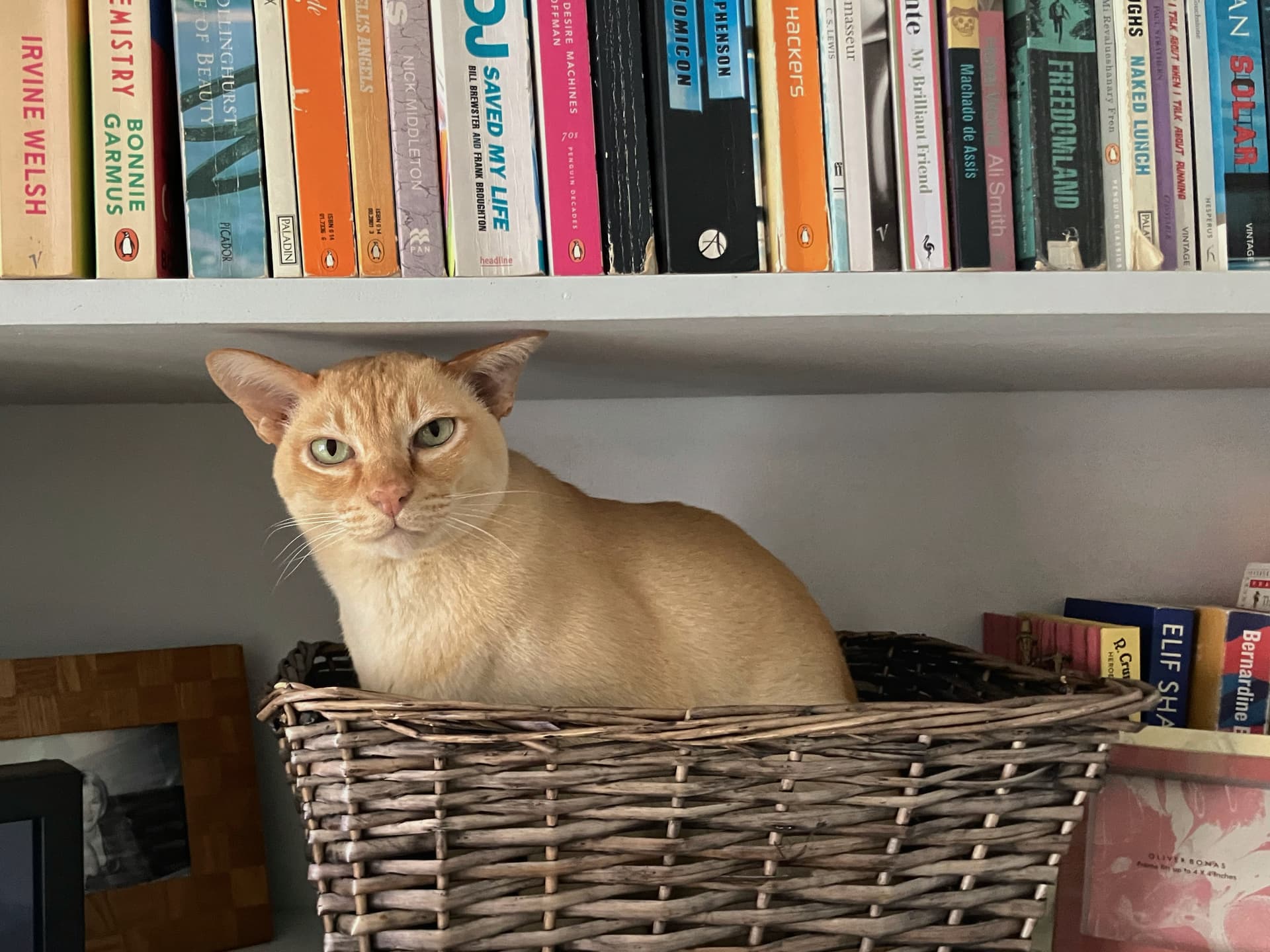 This is Alfie, we got him in 2007. Used to play fetch as a kitten; yells constantly unless sleeping or eating. Likes a cuddle but will bite your arm off when he emerges from “the zone”