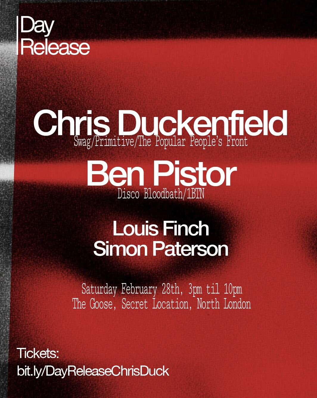 Facebook users: help us beat the algorithm and stick two fingers up at Zuckerberg by clicking “going” on the Facebook event. Invite your mates too!: Day Release with Chris Duckenfield, Ben Pistor