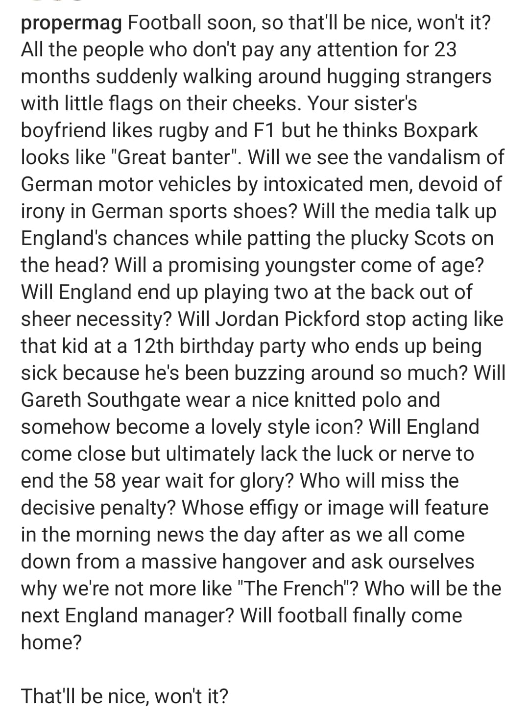 My general apathy with the England team shocks even myself, I even feel a tinge of guilt because this lot on the whole seem like a decent bunch and they can play a bit. Not sure what it is really, I’ve got friends who follow Wales and I could never imagine feeling as onboard with the national team like they do, similar situation with Scotland having lived up there and in-laws etc. Those flags on the cars annoy me… Are they still a thing!!!