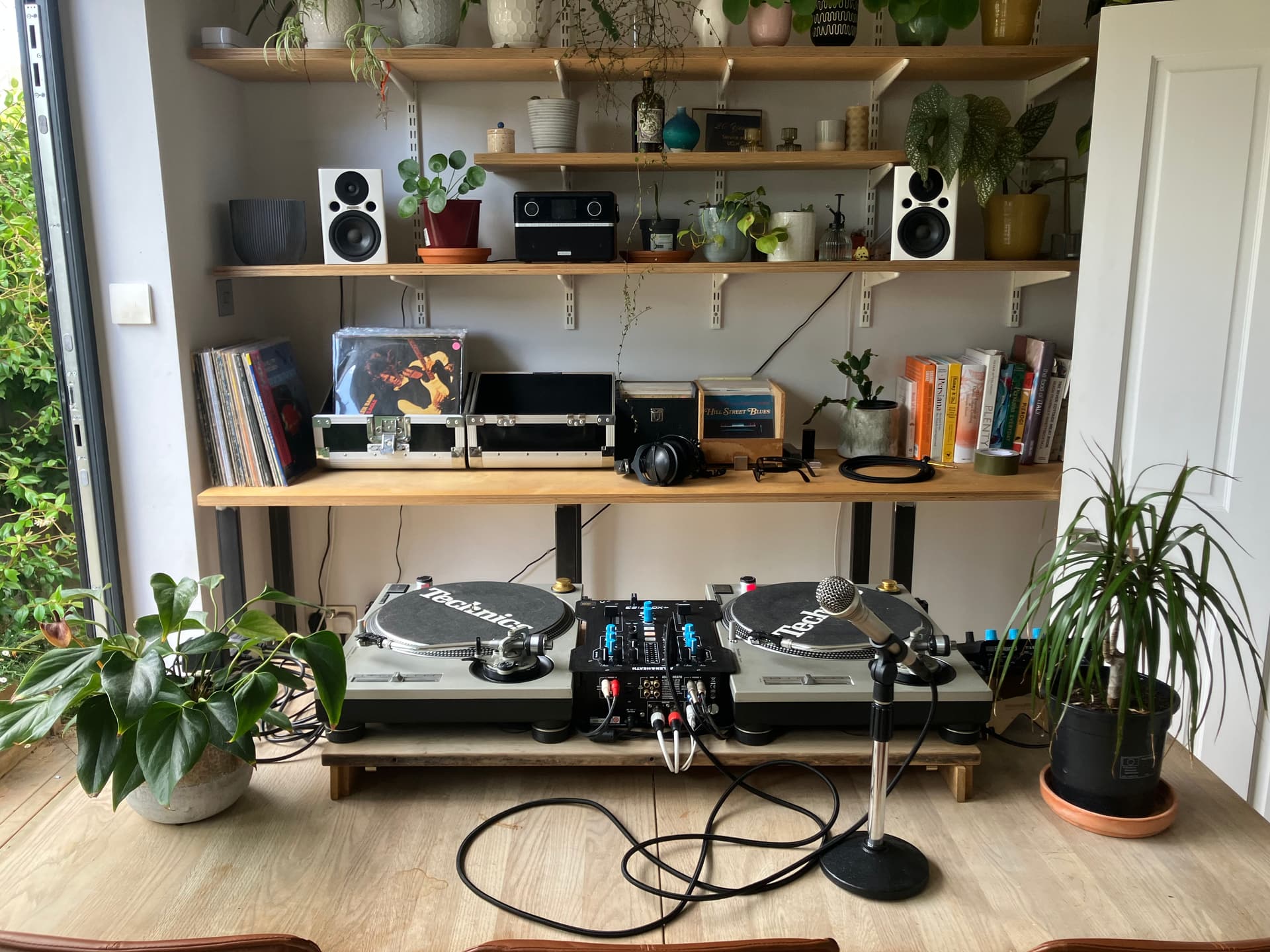 Temporary setup for some home sessions last week. There’s a sub under the table. Decks usually live on the bench behind.